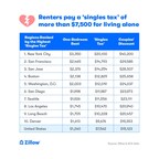 SEATTLE, Feb. 13, 2025 /PRNewswire/ -- Love might be priceless, but living alone sure isn't. The "singles tax" — the extra amount solo renters pay for a one-bedroom compared to splitting rent with roommates or partners — has soared to a record-high $7,562, according to a new Zillow Rentals analysis. While some may call it the price of peace and quiet, it's also equivalent to over 1,300 lattes or more than 12 years of some top-tier dating app subscriptions.